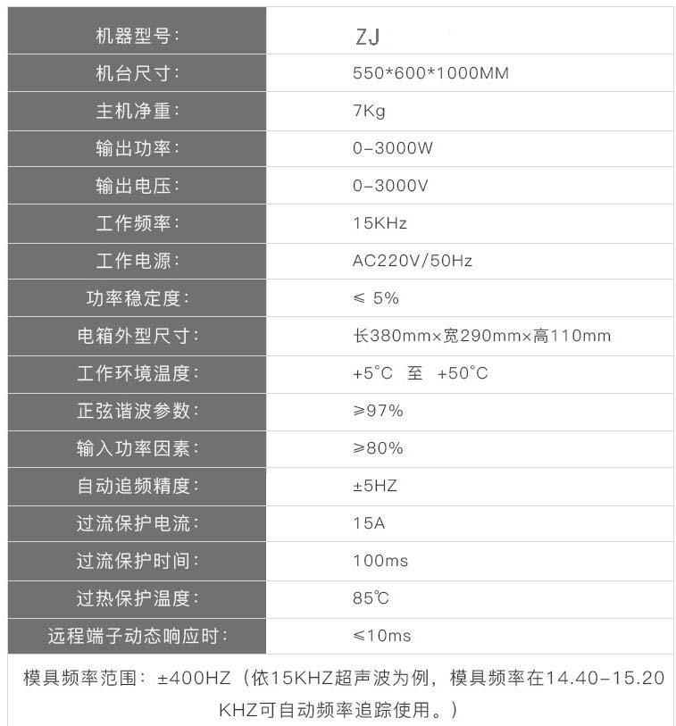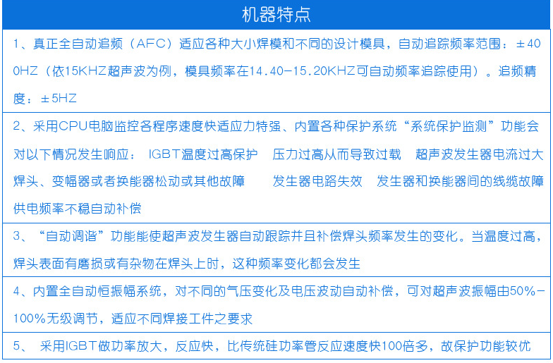 本機(jī)設(shè)有自動(dòng)追頻,裝上一個(gè)模具然后按下自動(dòng)追頻按鈕,機(jī)器跟模具會(huì)自動(dòng)匹配頻率,如果沒(méi)有自動(dòng)追頻是要人工慢慢調(diào),比較浪費(fèi)時(shí)間,而且要有經(jīng)驗(yàn)的師傅去調(diào)。