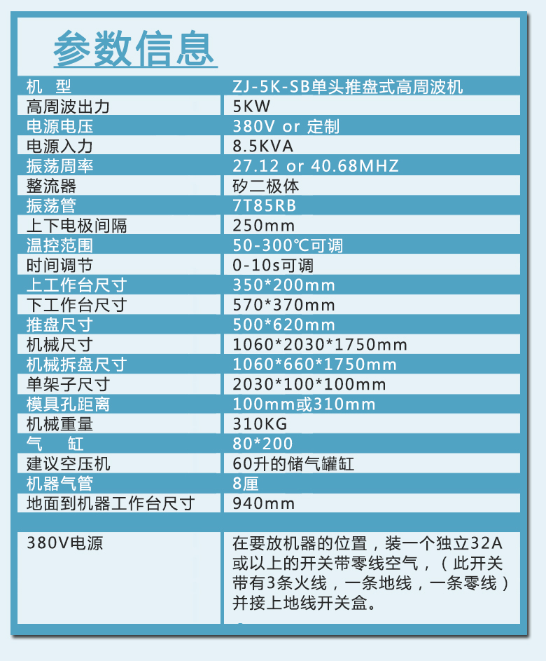 型 號:ZJ-5K-SB單頭推盤式高周波機